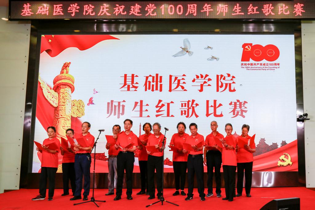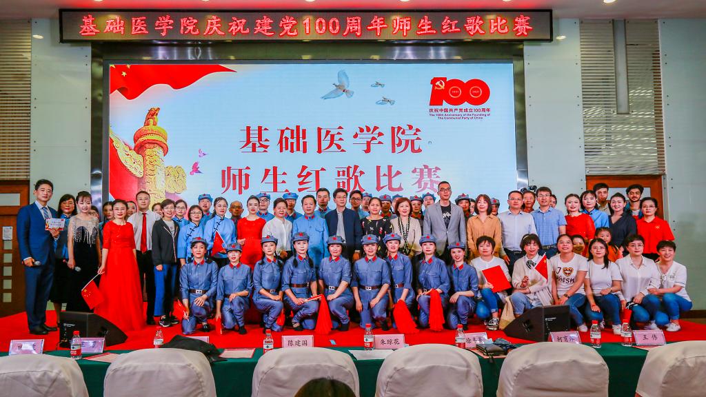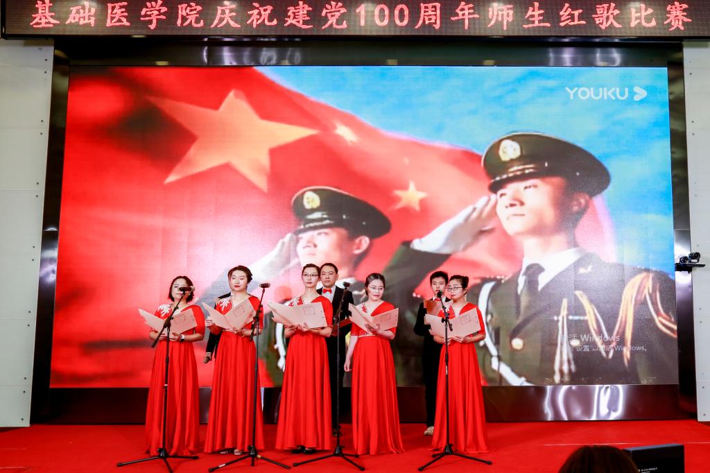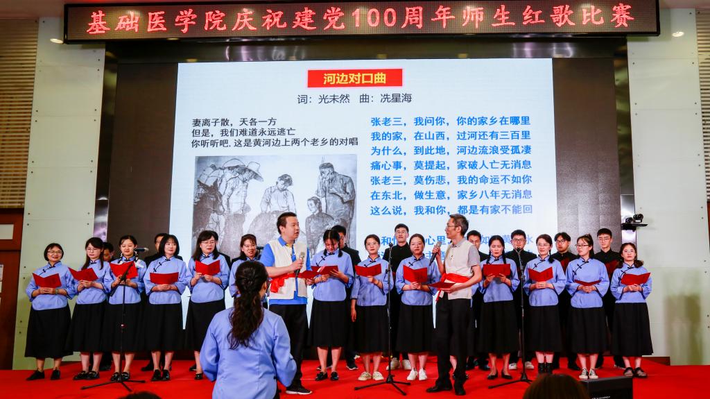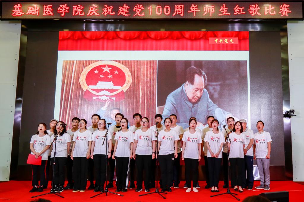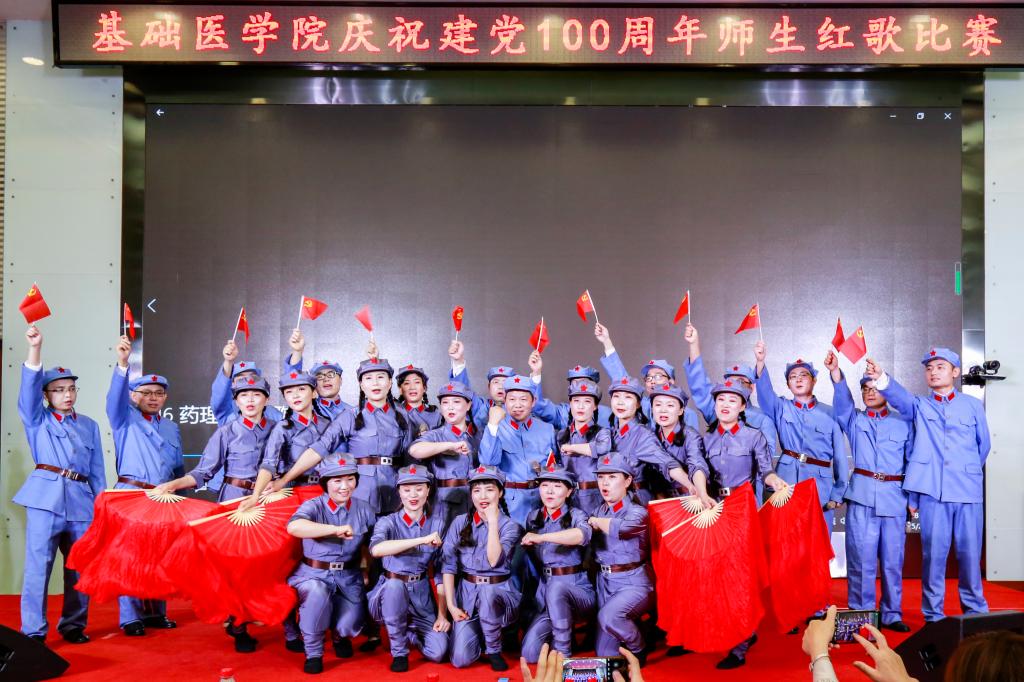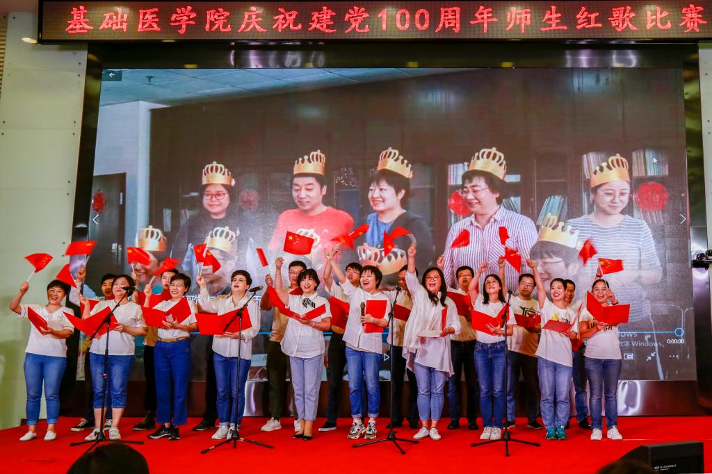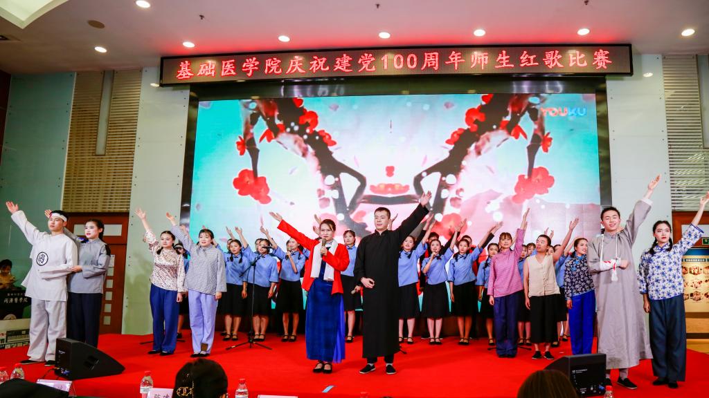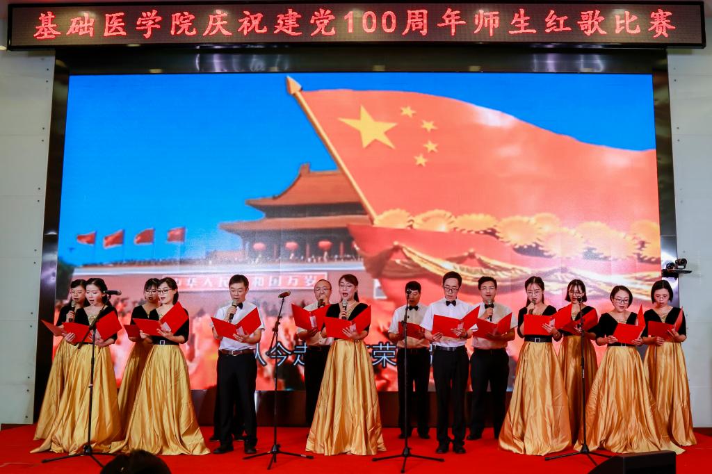 学院办公室全体职工激情洋溢的合唱《没有共产党就没有新中国》和《社会主义好》拉开了红歌比赛的序幕,饱含深情的演唱一下子带动了全场的气氛。学院各单位、退休支部和本科生、研究生、国际学生们精心准备了红歌合唱节目。组织学与胚胎学系师生合唱《歌唱祖国》、生理学系带来《红歌联唱》、遗传学系师生合唱《国家》、神经生物学系师生合唱《祖国不会忘记》、解剖学系师生带来《我和我的祖国》《没有共产党就没有新中国》、生物化学与分子生物学系师生合唱《唱红歌,学党史》、实验教学示范中心2位老师合唱《为了谁》、病原生物学系师生合唱《少年》、退休支部以笛子伴奏合唱《没有共产党就没有新中国》和《我们走在大路上》、病理学系师生合唱《我和我的祖国》、病理生理学系合唱《星辰大海》、本科生和研究生代表合唱《绣红旗》和《红梅赞》、国际留学生代表合唱《我和你》,免疫学系师生合唱《国际歌》,药理学系师生合唱《黄河大合唱》和《没有共产党就没有新中国》及歌伴舞《我爱你中国》和《红色娘子军》。师生们的演出虽不专业,但是创新的编排让一个个节目精彩纷呈,满含的爱国爱党深情让一曲曲演唱打动人心,全场不断掀起一个又一个高潮。