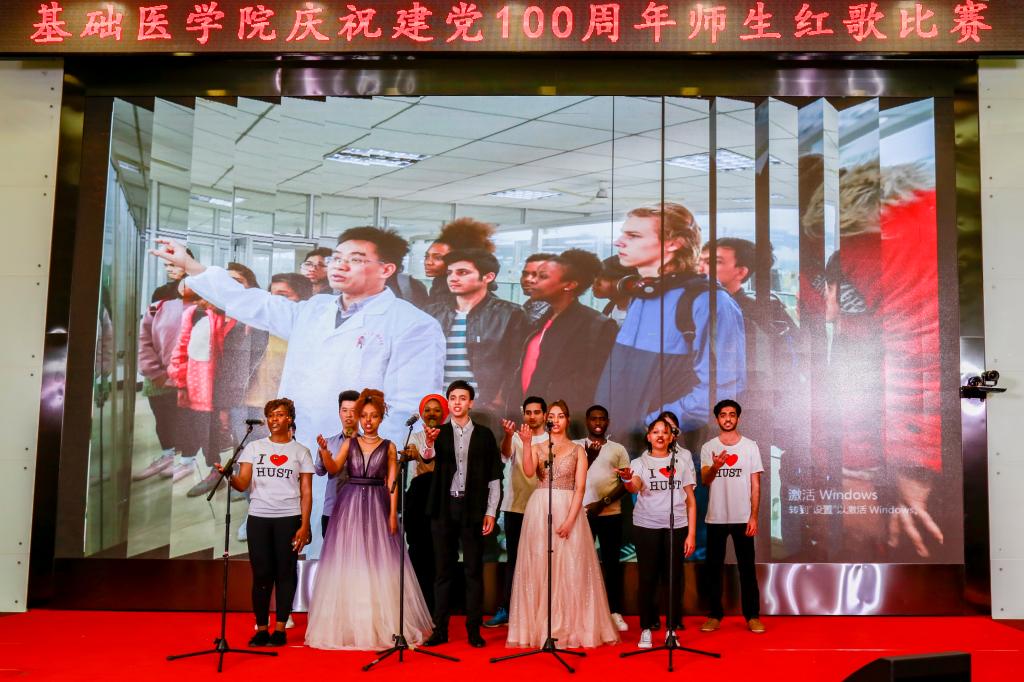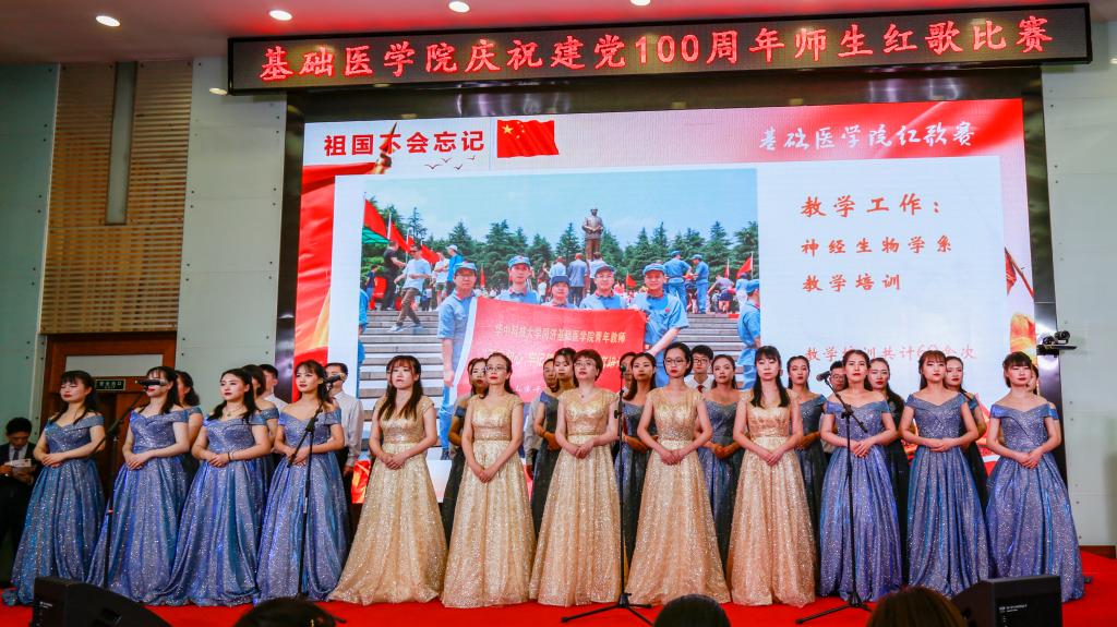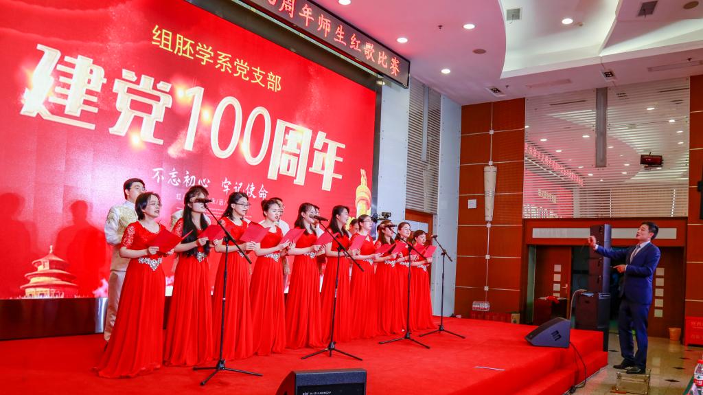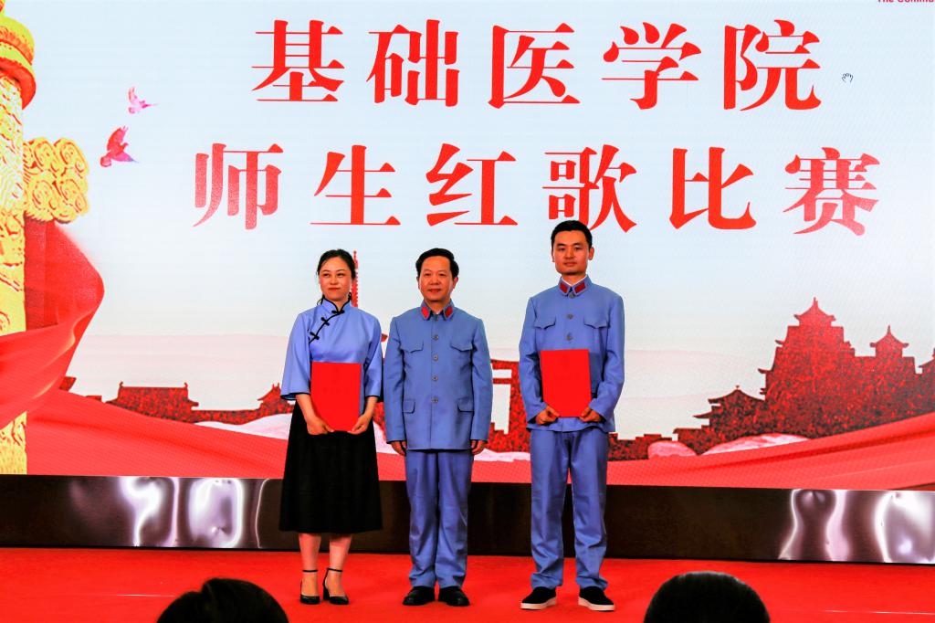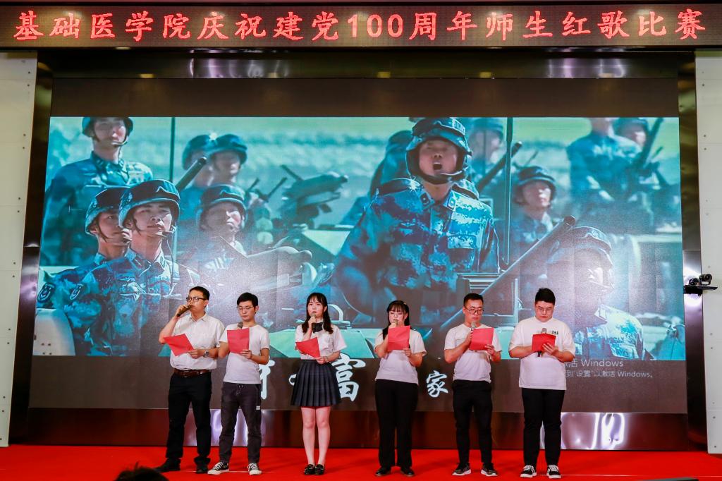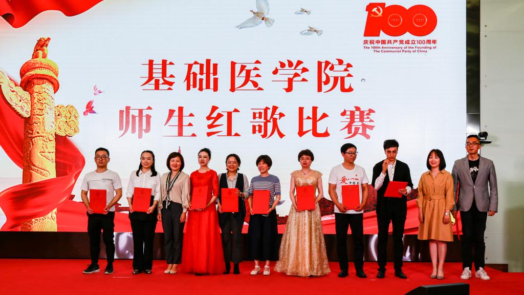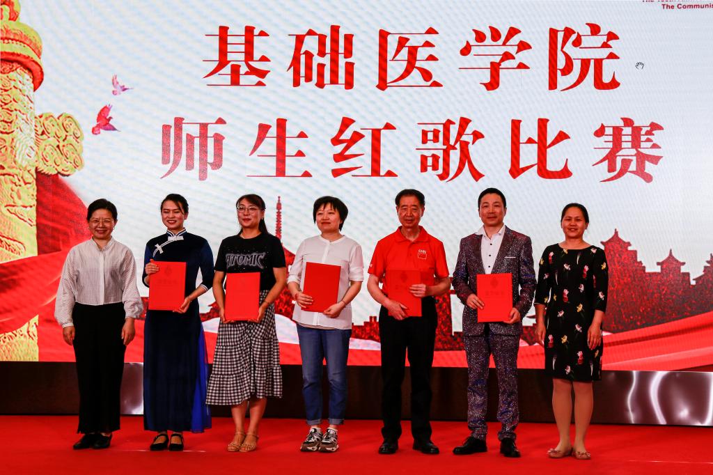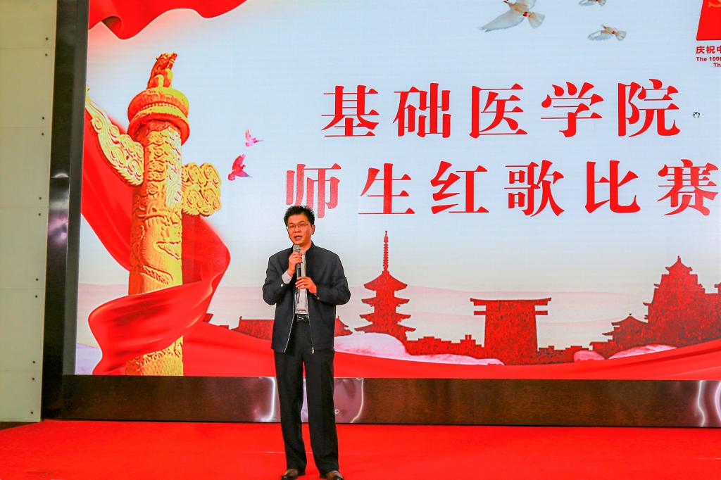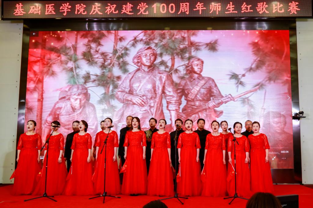 学院办公室全体职工激情洋溢的合唱《没有共产党就没有新中国》和《社会主义好》拉开了红歌比赛的序幕,饱含深情的演唱一下子带动了全场的气氛。学院各单位、退休支部和本科生、研究生、国际学生们精心准备了红歌合唱节目。组织学与胚胎学系师生合唱《歌唱祖国》、生理学系带来《红歌联唱》、遗传学系师生合唱《国家》、神经生物学系师生合唱《祖国不会忘记》、解剖学系师生带来《我和我的祖国》《没有共产党就没有新中国》、生物化学与分子生物学系师生合唱《唱红歌,学党史》、实验教学示范中心2位老师合唱《为了谁》、病原生物学系师生合唱《少年》、退休支部以笛子伴奏合唱《没有共产党就没有新中国》和《我们走在大路上》、病理学系师生合唱《我和我的祖国》、病理生理学系合唱《星辰大海》、本科生和研究生代表合唱《绣红旗》和《红梅赞》、国际留学生代表合唱《我和你》,免疫学系师生合唱《国际歌》,药理学系师生合唱《黄河大合唱》和《没有共产党就没有新中国》及歌伴舞《我爱你中国》和《红色娘子军》。师生们的演出虽不专业,但是创新的编排让一个个节目精彩纷呈,满含的爱国爱党深情让一曲曲演唱打动人心,全场不断掀起一个又一个高潮。