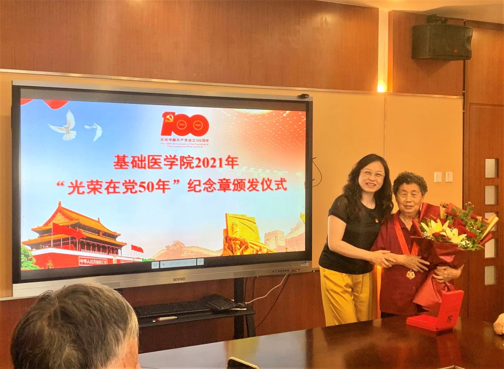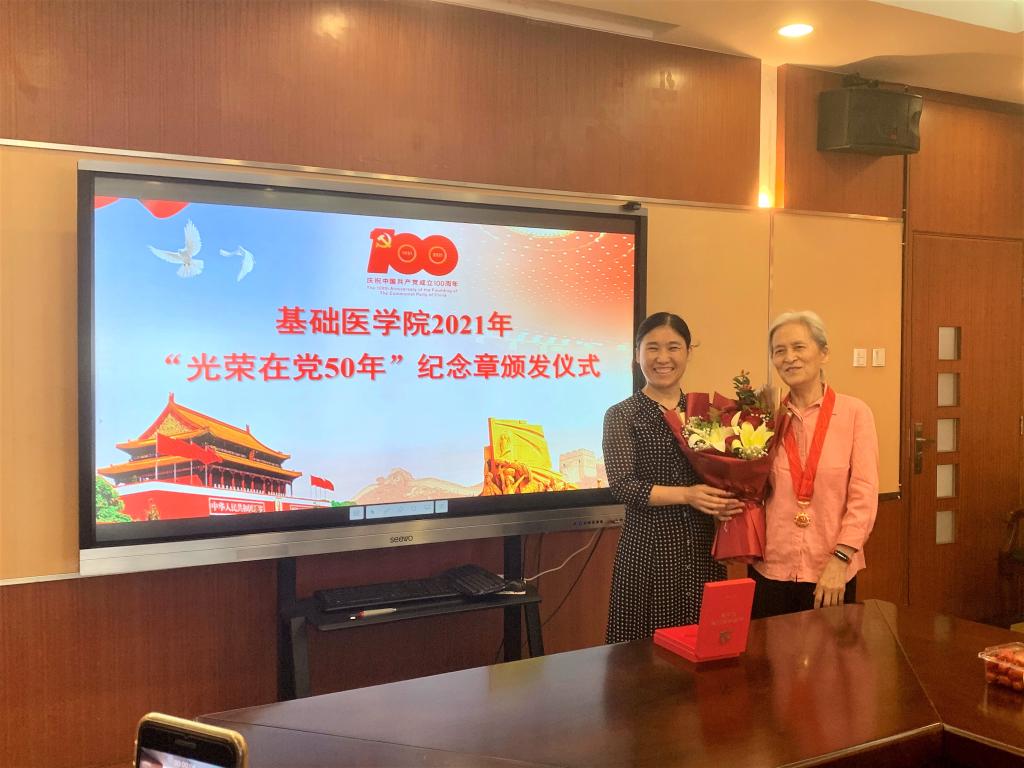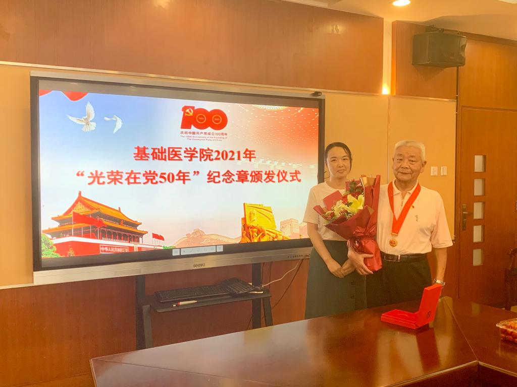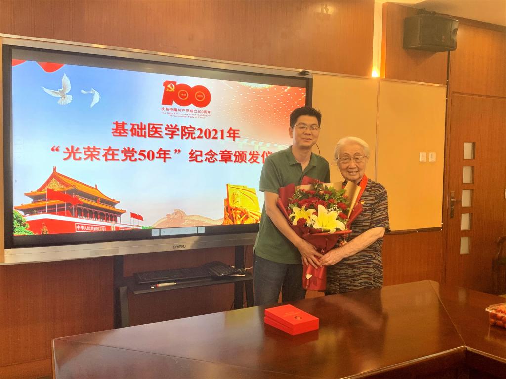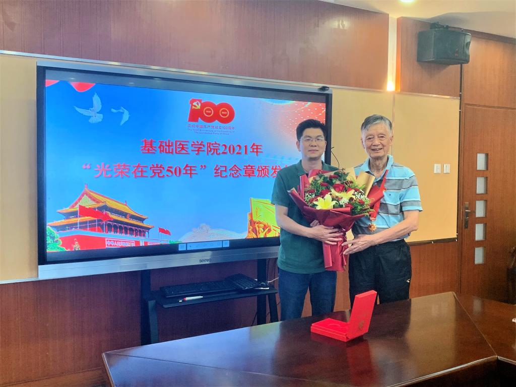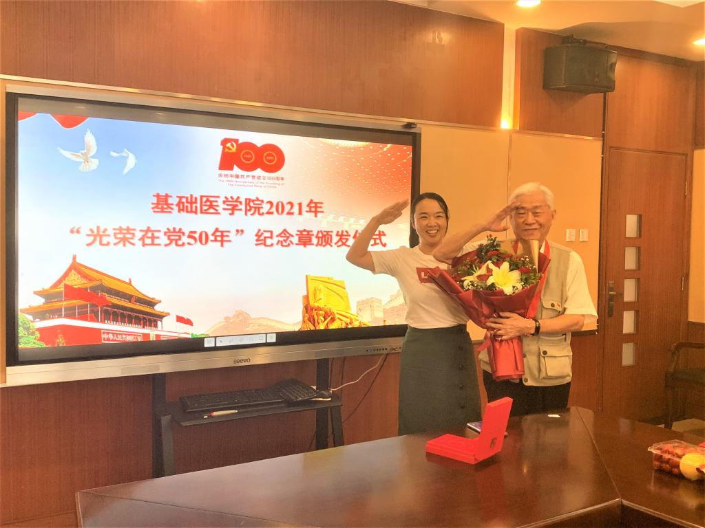 学院对身体不宜参加活动的7位老同志上门送去纪念章,其他在外地9位老党员的纪念章由支部书记或子女代领,负责将纪念章发放到位。